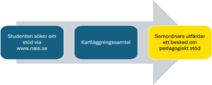 Studenter i behov av pedagogiskt stöd kan ansöka om detta i ett administrativt system som heter Nais. I ansökan måste studenten bifoga ett intyg som styrker en varaktig funktionsnedsättning. När samordnaren tagit emot ansökan kontaktas studenten för att boka ett kartläggande samtal. Utifrån ansökan och samtal kan samordnaren sedan utfärda ett besked om stöd.